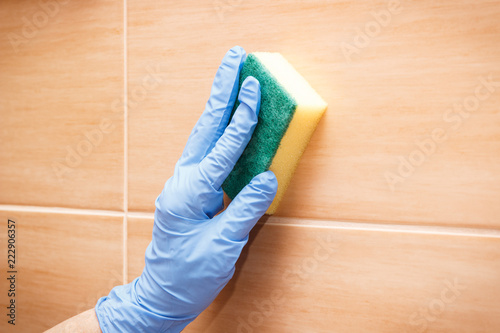 Hand Of Senior Woman Wiping Bathroom Tiles Using Sponge Household