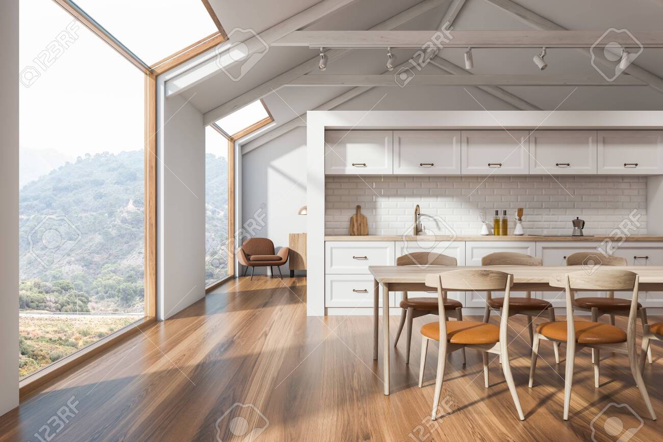 Side View Of Scandinavian Kitchen With White Walls White Wooden